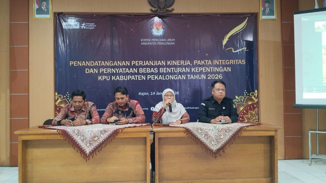 #TemanPemilih, KPU Kabupaten Pekalongan melaksanakan kegiatan Penandatanganan Perjanjian Kinerja, Pakta Integritas dan Pernyataan Bebas Benturan Kepentingan KPU Kabupaten Pekalongan Tahun 2026. Rabu (14 Januari 2026). Penandanganan dilaksanakan di aula kantor KPU Kabupaten Pekalongan. Penandatanganan ini merupakan bentuk komitmen bersama dalam mewujudkan tata kelola kelembagaan yang berintegritas, profesional, transparan dan akuntabel serta sebagai langkah nyata dalam mendukung pembangunan Zona Integritas di Lingkungan KPU Kabupaten Pekalongan. Melalui kegiatan ini KPU Kabupaten Pekalongan menegaskan kesiapan menjalankan tugas secara transparan, akuntabel dan berorientasi pada peningkatan kualitas pelayanan kepemiluan. #kpukabpekalongan #kpumelayani ....