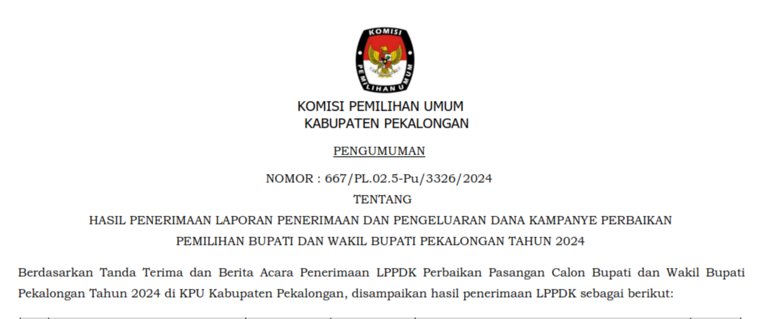 Pengumuman Nomor 547/PL.02.4-Pu/3326/2024 Tentang Hasil Penerimaan Laporan Penerimaan Sumbangan Dana Kampanye Pemilihan Bupati Dan Wakil Bupati Pekalongan Tahun 2024 Silahkan Unduh