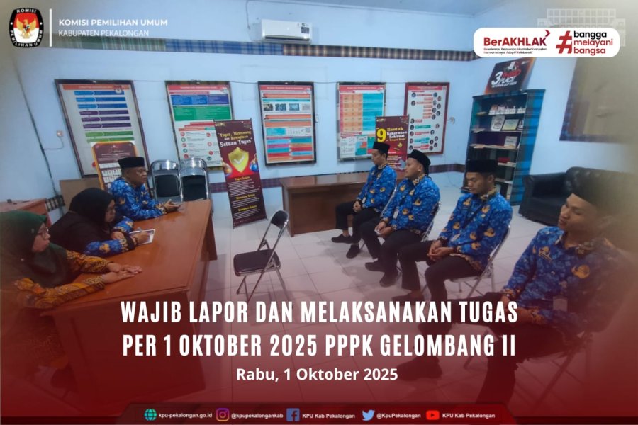 #TemanPemilih, Menindaklanjuti surat KPU RI tentang Pengumuman No. 154/SDM.02.1-Pu/04/2025 tentang Panggilan melaksanakan tugas Pegawai Pemerintah dengan Perjanjian Kerja (PPPK) tenaga teknis dan tenaga lainnya di Lingkungan Sekretariat Jenderal KPU tahun Anggaran 2024 Periode II yang telah ditetapkan oleh BKN. Di KPU Kabupaten Pekalongan terdapat sebanyak 4 orang yang telah resmi diangkat menjadi PPPK Gelombang II terhitung per 1 Oktober 2025 dan telah menghadap kepada KPU Kabupaten Pekalongan. 4 orang tersebut yaitu: Arif Hidayat, Bayu Purnomo, Abdi Prasetyo dan Junaryo. Ke 4 orang tersebut telah menghadap dan diberikan penjelasan dan arahan oleh Ketua, Sekretaris dan Kasubbag SDM dan Parmas. Diharapkan untuk PPPK yang telah ditetapkan berkomitmen penuh melaksanakan tugas sesuai perjanjian kerja dengan profesionalisme dan integritas, menjunjung tinggi nilai-nilai ASN BerAKHLAK dan selalu siap menjalankan tugas.