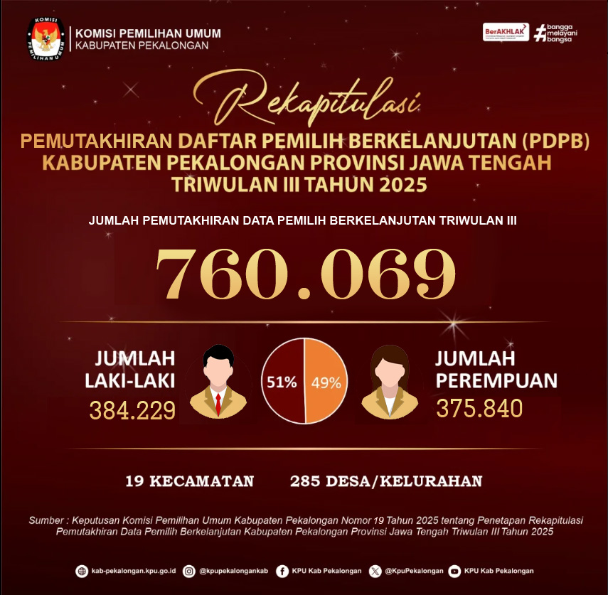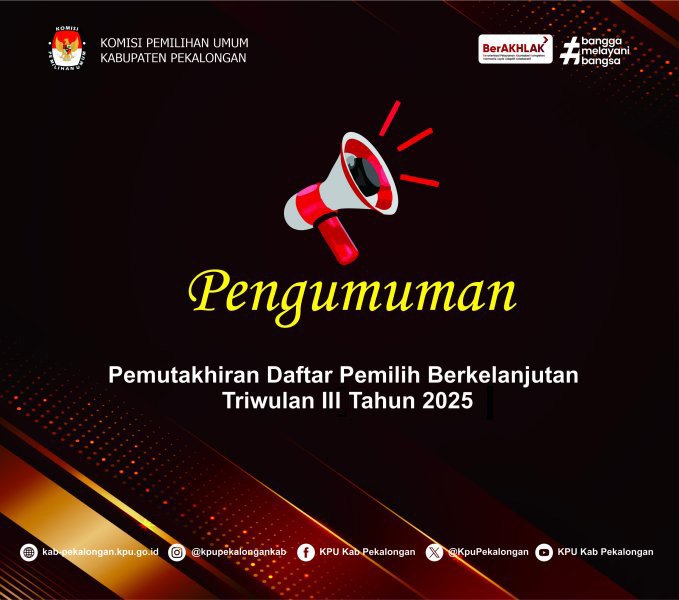 #Teman Pemilih berikut adalah Keputusan KPU Kabupaten Pekalongan Nomor 19 Tahun 2025 tentang Penetapan Rekapitulasi Pemutakhiran Daftar Pemilih Berkelanjutan Triwulan II Tahun 2025, dokumen dapat diunduh disini