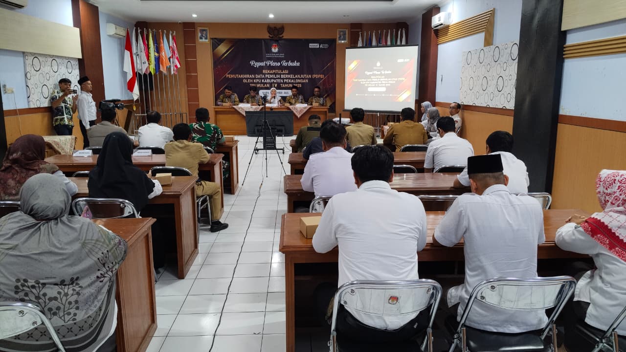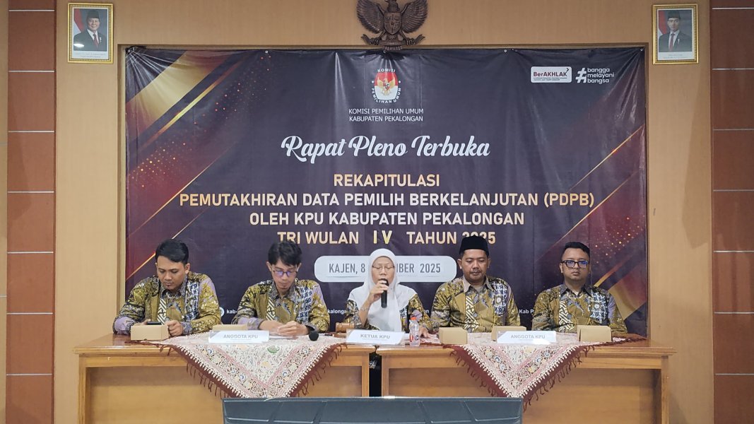 Sigit Prayitno selaku Ketua Divisi Perencanaan Data dan Informasi KPU Kabupaten Pekalongan membacakan hasil Rekapitulasi Pemutakhiran Data Pemilih Berkelanjutan (PDPB) Triwulan IV Tingkat Kabupaten Pekalongan, selanjutnya KPU Kabupaten Pekalongan menetapkan Rekapitulasi Pemutakhiran Data Pemilih Berkelanjutan (PDPB) Triwulan IV Tahun 2025 sejumlah 768.764 Pemilih, yang terdiri dari 388.696 pemilih laki-laki dan 380.068 pemilih Perempuan, di tetapkan dengan Keputusan KPU Kabupaten Pekalongan Nomor 23 Tahun 2025.