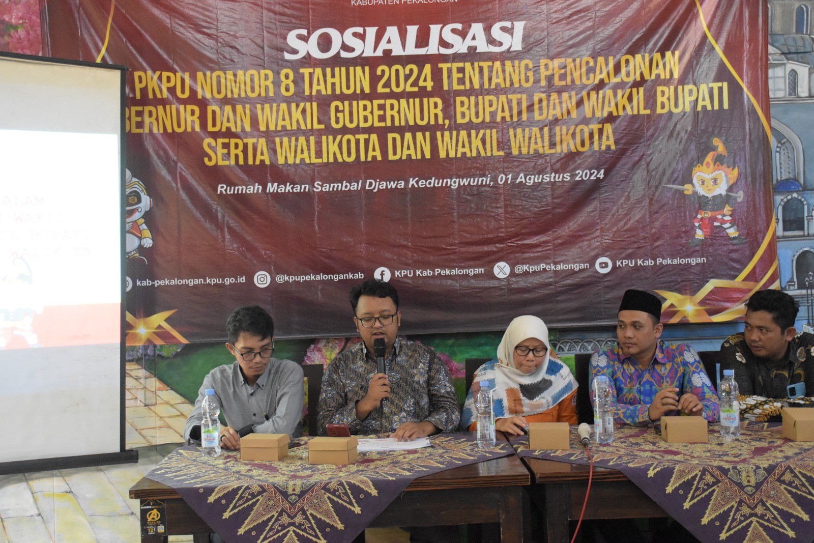 Kegiatan dilaksanakan di RM. Sambal Djawa. Jl. Raya Podo, Perum Villa Asri, Kec. Kedungwuni dengan mengundang, Partai Politik Peserta Pemilu Tahun 2024, stake holder, Desk Pilkada 2024, Ormas dan Ketua PWI Kabupaten Pekalongan. Kegiatan diawali dengan Sambutan dari Ketua KPU Kabupaten Pekalongan Laelatul Izah yang sekaligus membuka acara. Dalam sambutannya Izah menyampaikan, merupakan kewajiban KPU Kabupaten Pekalongan untuk mensosialisasikan PKPU Nomor 8 Tahun 2024 dengan harapan dapat memberikan Informasi yg dibutuhkan terutama Partai Politik untuk mempersiapkan Pasangan Calon Bupati dan Wakil Bupati Pekalongan Tahun 2024. Selanjutnya penyampaian materi oleh Syafiq Naqsyabandi (anggota KPU Kabupaten divisi Teknis Penyelenggaraan) dengan menyampaikan materi Sosialisasi PKPU nomor 8 Tahun 2024.