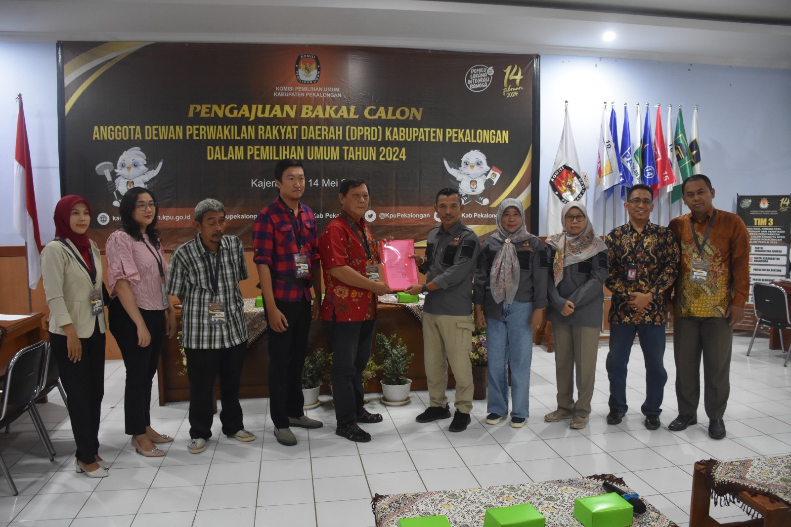 Dokumen diterima oleh Ketua KPU Kabupaten Pekalongan Abi Rizal didampingi Anggota KPU dan disaksikan oleh Bawaslu Kabupaten Pekalongan. Selanjutnya berkas diteliti oleh Tim Verifikasi melalui Aplikasi Silon dengan hasil Jumlah berkas yang diserahkan terdiri dari 45 bakal calon. Setelah melalui proses verifikasi dilakukan berkas dinyatakan lengkap dan diterima.