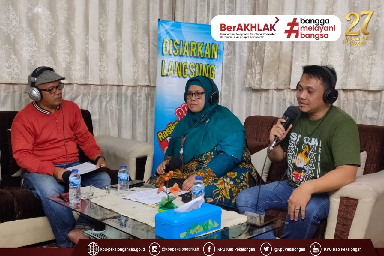 Sebagai narasumber untuk edisi kali ini, BERPALEKAT menghadirkan Fatkhuddin (Kadiv. Hukum dan Pengawasan KPU Kabupaten Pekalongan) dan Endang Tri Lasmini (Kasubag Hukum dan SDM KPU Kabupaten Pekalongan) sedangkan host yang memandu acara ini adalah Jamil SS dari Rasika FM.