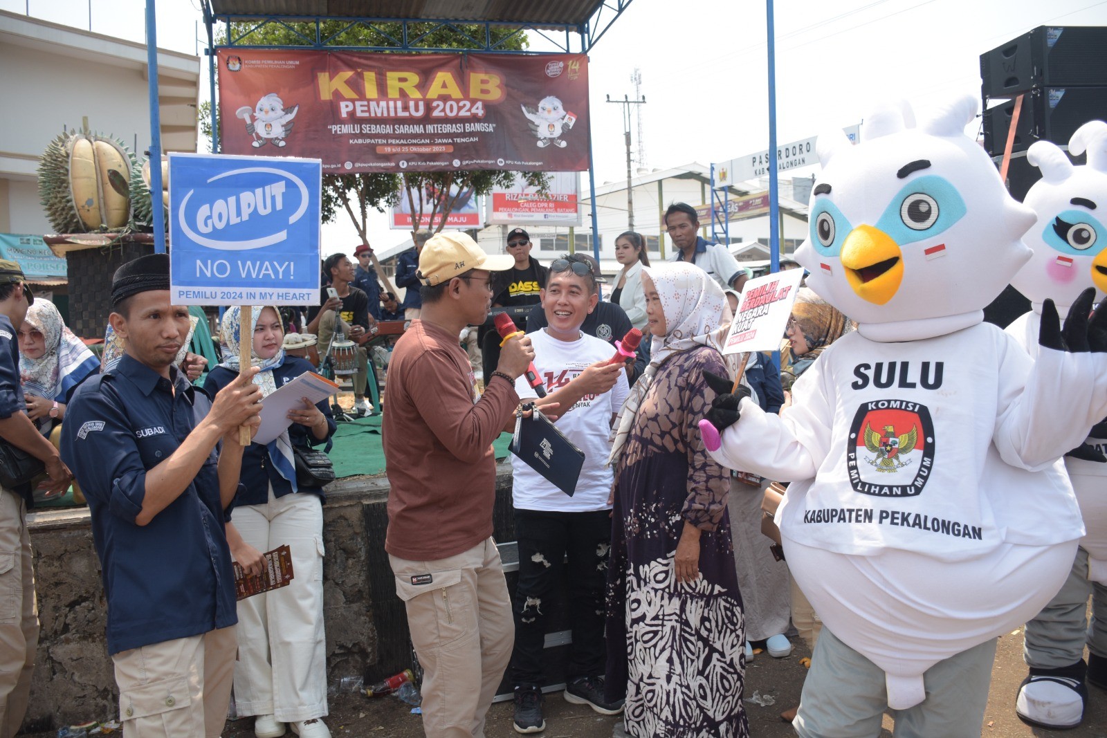 Kab-pekalongan.kpu.go.id - KPU Kabupaten Pekalongan menggelar sosialisasi di tempat keramaian pada hari ke-3 Kirab Pemilu 2024 di pasar tradisional Doro, Sabtu (21/10/2023) Rombongan KPU tiba di pasar doro pukul 09.30 WIB. Tempat lokasi panggung kegiatan di depan pasar doro tepatnya di tengah pertigaan jalan depan pasar. Kegiatan awal yang dilakukan langsung mengggelar orgen music local mengawali membuka kegiatan sosialisasi. Dalam kegiatan sosialisasi tersebut Anggota KPU Kabupaten Pekalongan Achyar Budi Pranoto bersama M. Ahsin menyampaiakan tentang bagaimana tata cara pindah memilih, mengenalkan nomor urutan partai politik , cek DPT online, 5 surat suara dan mengajak masyarakat untuk memberikan suaranya pada tanggal 14 Februari 2024. Dilanjutkan dengan Kuis Seputar Kepemiluan dengan Hadiah Bahan Sosialisasi berupa Dompet dan Mug. Bersama PPK dan PPS Kecamatan doro sebagian rombongan Sosialisasi bergerak menyambangi para pedagang pasar doro dengan memberikan Flyer berisi informasi tentang Daerah Pemilihan dan Alokasi Kursi Anggota DPRD Kabupaten Pekalongan, Tata cara pindah memilih, pelayanan pindah memilih, nomor urut partai politik, cek dpt online dan ajakan untuk menggunakan hak pilihmu pada hari rabu 14 Februari 2024. KPU membagikan sebanyak 500 Flyer kepada para pedagang dan warga masyarakat di sekitar lokasi dan sebagian pengendara sepeda motor yang sedang melintas di depan panggung lokasi kegiatan sosialisasi. Estimasi sekitar 250 orang para pedagang dan masyarakat sekitar tersosialisasikan dengan baik. Hari ini juga PPK bersama PPS melaksanakan Kegiatan sosialisasi di pasar pasar di wilayah kecamatan masing masing.