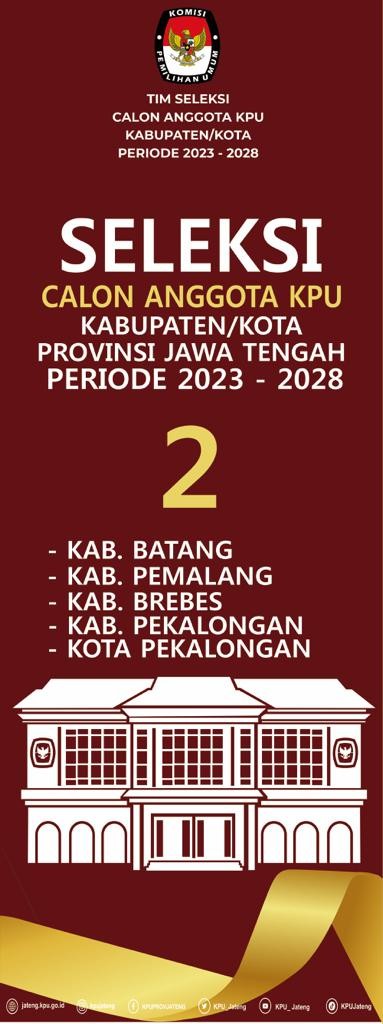 PENGUMUMAN HASIL SELEKSI BAKAL CALON ANGGOTA KPU KABUPATEN/KOTA DI JAWA TENGAH 2 PERIODE 2023-2028 Senin, 31 Juli 2023 16:56 288 Selengkapnya Klik PENGUMUMAN HASIL SELEKSI BAKAL CALON ANGGOTA KPU KABUPATEN/KOTA DI JAWA TENGAH 2 PERIODE 2023-2028 Baca Selengkapnya