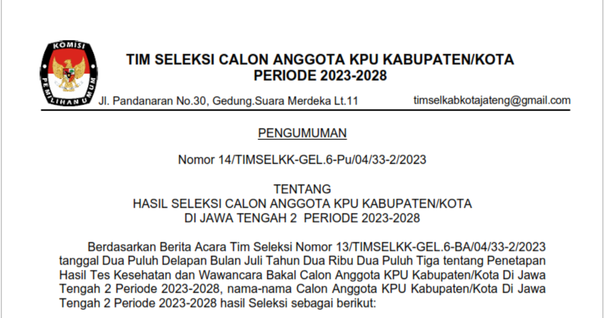 Pengumuman Hasil Penelitian Administrasi Bakal Calon Anggota KPU Kabupaten/Kota Di Jawa Tengah 2 Periode 2023-2028 Senin, 03 Juli 2023 07:00 339 Pengumuman Hasil Penelitian Administrasi Bakal Calon Anggota KPU Kabupaten/Kota Di Jawa Tengah 2 Periode 2023-2028 Silahkan Unduh Baca Selengkapnya