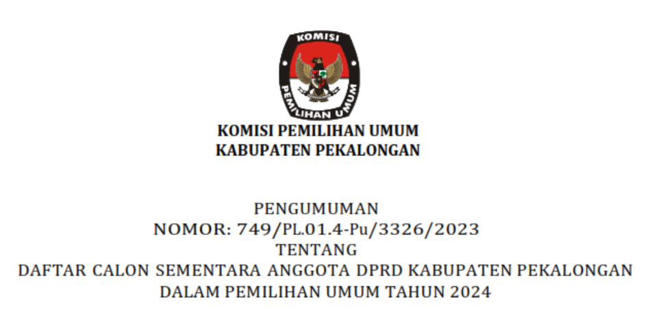 PENGUMUMAN DAFTAR CALON SEMENTARA ANGGOTA DPRD KABUPATEN PEKALONGAN DALAM PEMILIHAN UMUM TAHUN 2024 Sabtu, 19 Agustus 2023 05:00 1729 Selengkapnya klik Pengumuman Daftar Calon Sementara Anggota DPRD Kabupaten Pekalongan Dalam Pemilihan Umum Tahun 2024 Klik disini Baca Selengkapnya