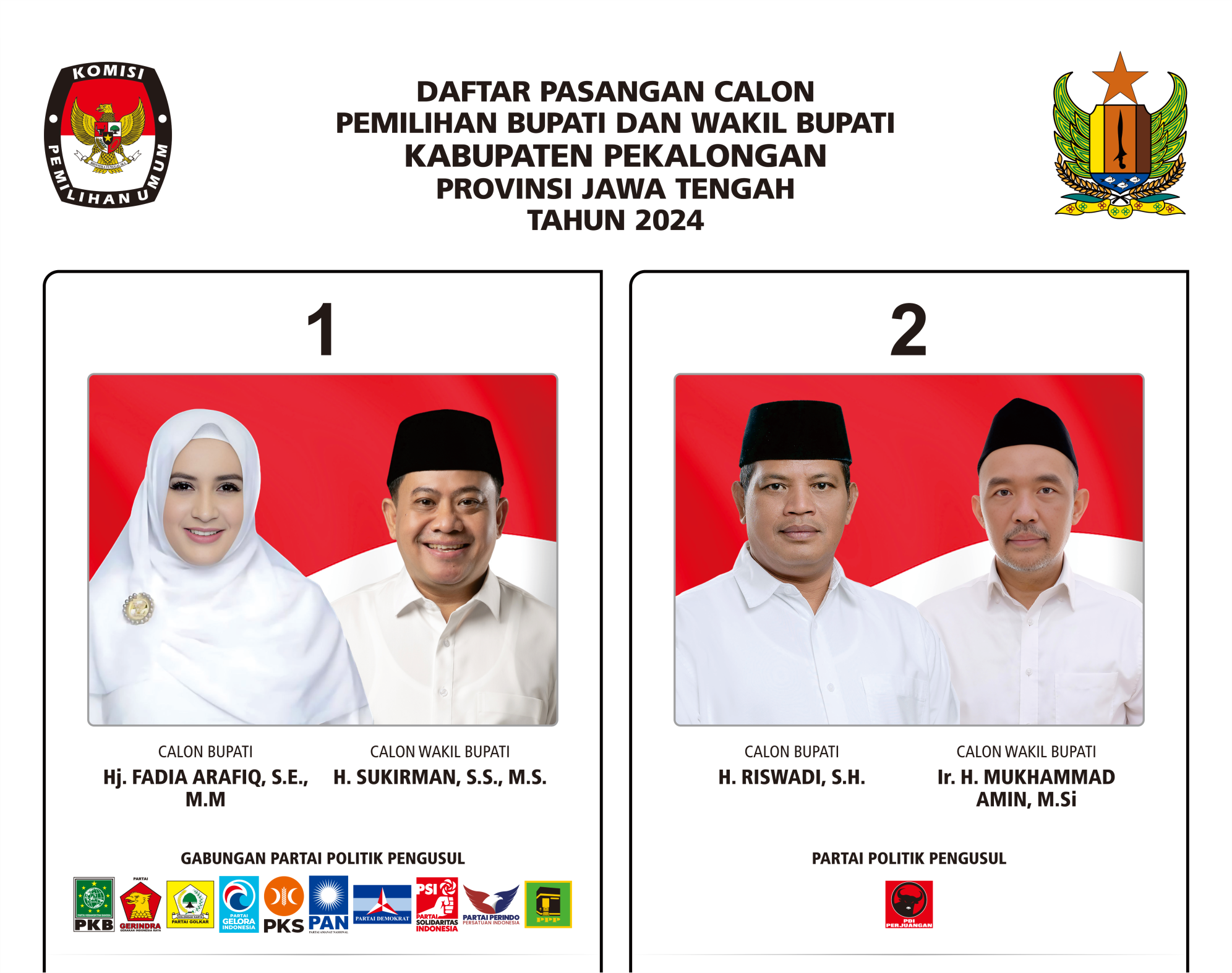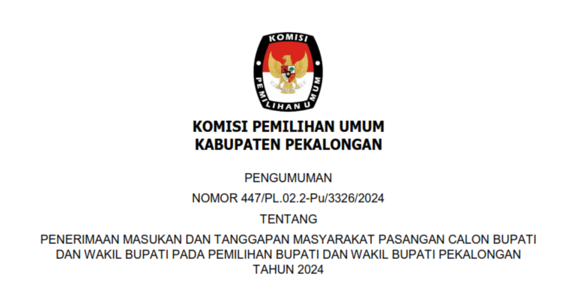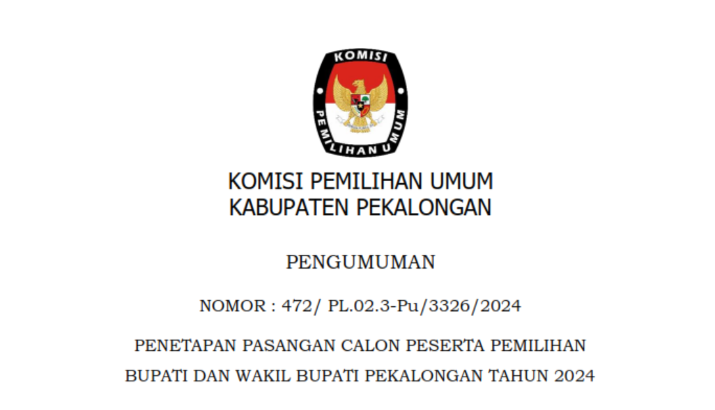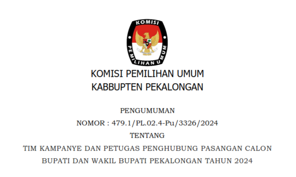 PENGUMUMAN TIM KAMPANYE DAN PETUGAS PENGHUBUNG KAMPANYE PASANGAN CALON BUPATI DAN WAKIL BUPATI PEKALONGAN TAHUN 2024, dapat diakses di sini