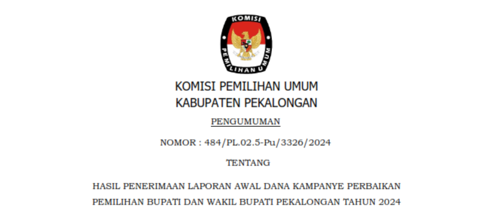 Bahwa untuk melaksanakan ketentuan Pasal 8 Peraturan Komisi Pemilihan Umum Nomor 13 Tahun 2024 tentang Kampanye Pemilihan Gubernur dan Wakil Gubernur, Bupati dan Wakil Bupati, serta Walikota dan Wakil Walikota. KPU Kabupaten Pekalongan mengumumkan Tim Kampanye dan Petugas Penghubung Pasangan Calon Bupati dan Wakil Bupati Pekalongan Tahun 2024 yang dapat di unduh melalui tautan https://bit.ly/TimKampanye_PilbupPekalongan2024
