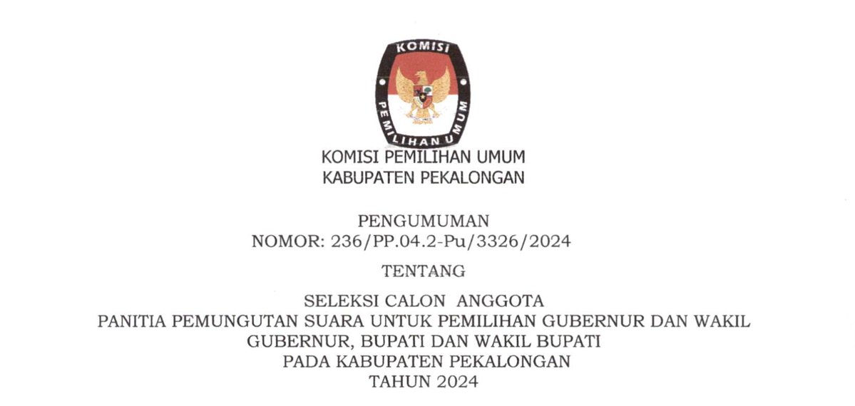 Pengumuman Seleksi Calon Anggota Panitia Pemungutan Suara (PPS) Untuk Pemilihan Gubernur Dan Wakil Gubernur, Bupati Dan Wakil Bupati Pada Kabupaten Pekalongan Tahun 2024.