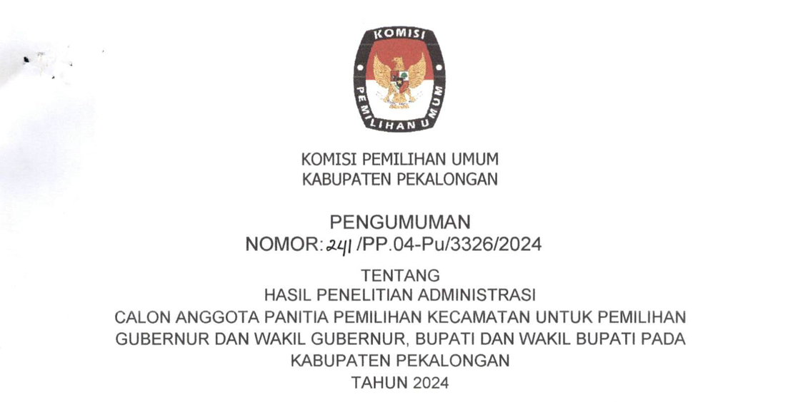 Pengumuman Nomor 241/PP.04-Pu/3326/2024 Tentang Hasil Penelitian Administrasi Calon Anggota Panitia Pemilihan Kecamatan (PPK) Untuk Pemilihan Gubernur Dan Wakil Gubernur, Bupati Dan Wakil Bupati Pada Kabupaten Pekalongan Tahun 2024.