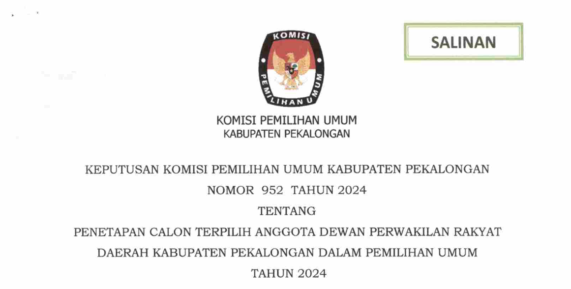 Keputusan Komisi Pemilihan Umum Kabupaten Pekalongan Nomor 952 Tahun 2024 tentang Penetapan Calon Terpilih Anggota Dewan Perwakilan Rakyat Daerah (DPRD) Kabupaten Pekalongan Dalam Pemilu Tahun 2024