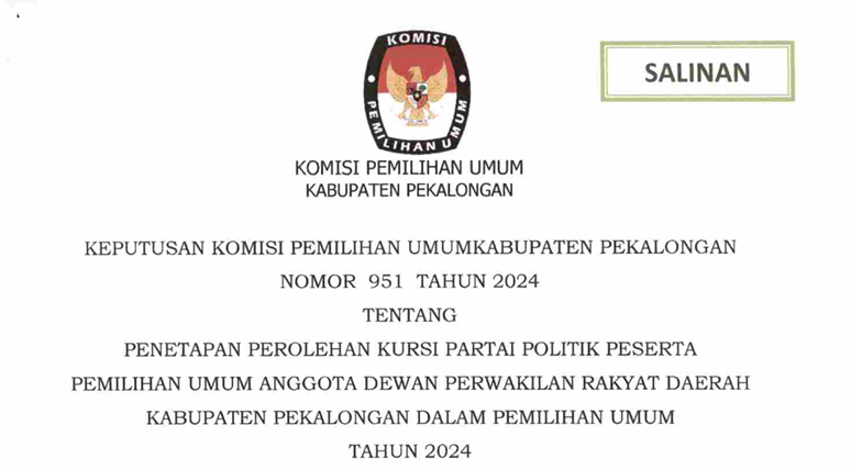 Keputusan Nomor 951 Tahun 2024 Tentang Penetapan Perolehan Kursi Partai Politik Peserta Pemilihan Umum Anggota Dewan Perwakilan Rakyat Daerah Kabupaten Pekalongan Dalam Pemilihan Umum Tahun 2024