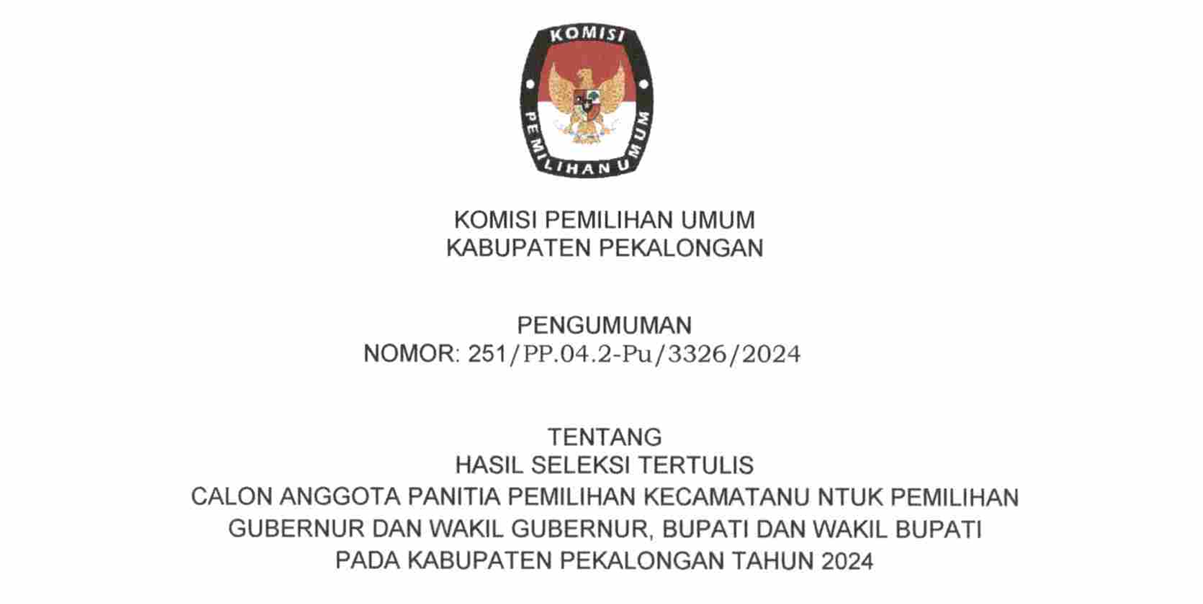 Pengumuman Nomor 251/PP.04.2-Pu/3326/2024 Tentang Hasil Seleksi Tertulis Calon Anggota Panitia Pemilihan Kecamatan (PPK) Untuk Pemilihan Gubernur Dan Wakil Gubernur, Bupati Dan Wakil Bupati Pada Kabupaten Pekalongan Tahun 2024.