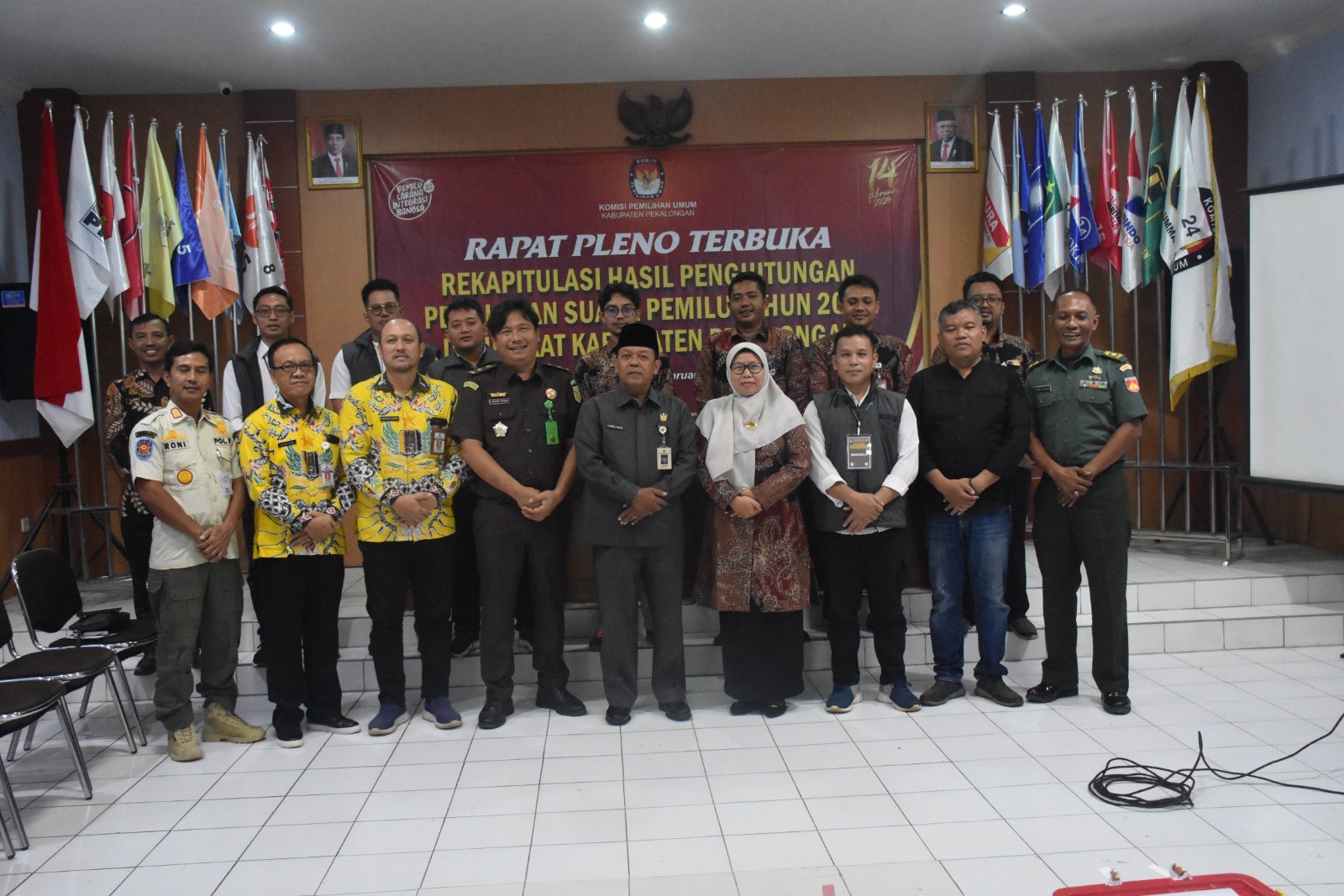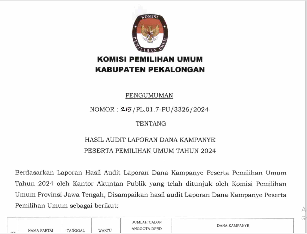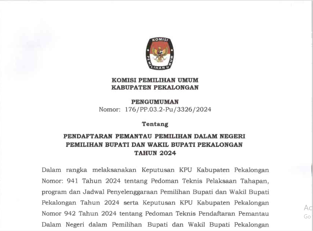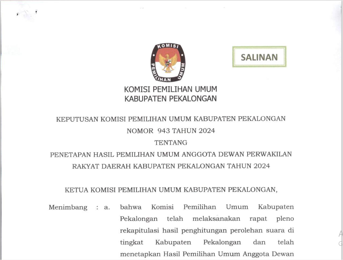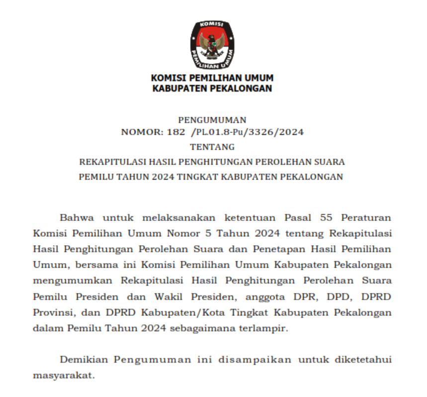 Bahwa untuk melaksanakan ketentuan Pasal 55 Peraturan Komisi Pemilihan Umum Nomor 5 Tahun 2024 tentang Rekapitulasi Hasil Penghitungan Perolehan Suara dan Penetapan Hasil Pemilihan Umum, bersama ini Komisi Pemilihan Umum Kabupaten Pekalongan mengumumkan Rekapitulasi Hasil Penghitungan Perolehan Suara Pemilu Presiden dan Wakil Presiden, anggota DPR, DPD, DPRD Provinsi, dan DPRD Kabupaten/Kota Tingkat Kabupaten Pekalongan dalam Pemilu Tahun 2024 sebagaimana terlampir. Demikian pengumuman ini disampaikan untuk diketahui masyarakat.